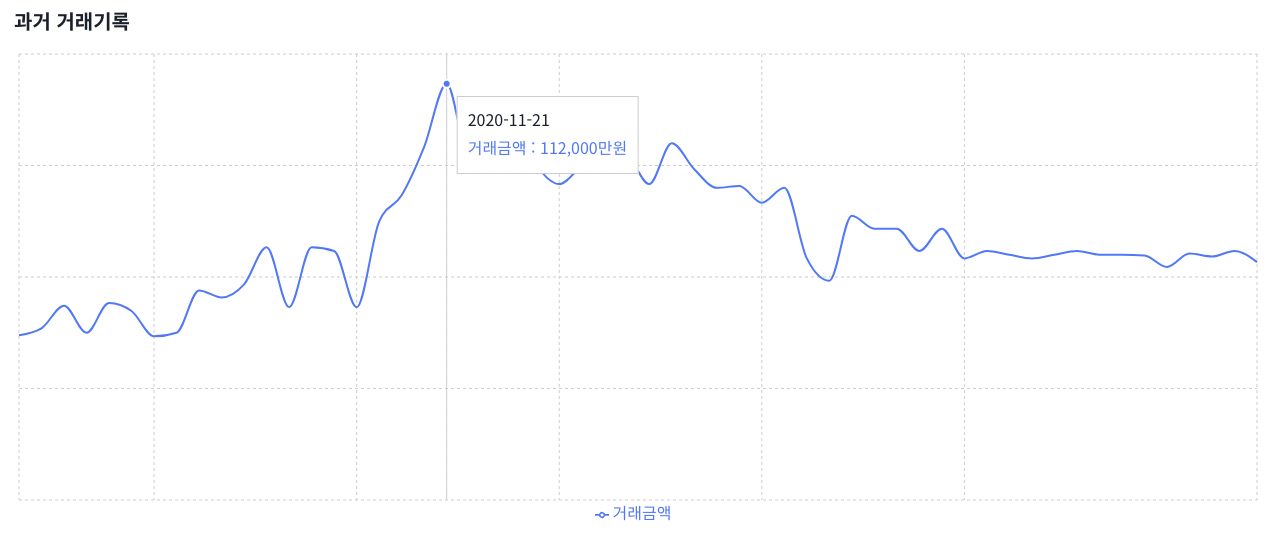 또한 신고가 이후에는 조금씩 하락을 하다가 현재는 가격이 거의 일정하게 유지되고 있다는 사실도 알 수 있습니다.