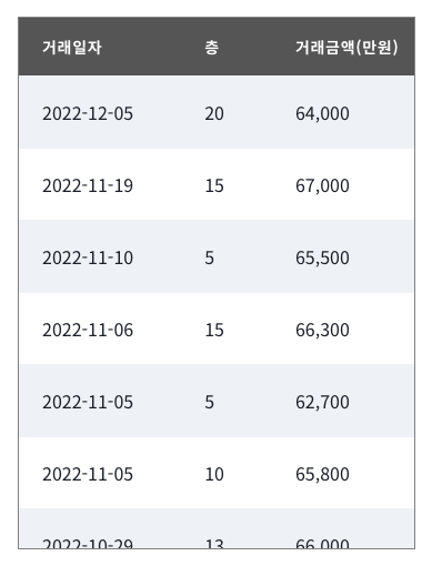 위 표에서 보시는 것처럼 최근 거래내역들의 가격은 6억5천만원 전후로 거의 일정하게 유지되는 것을 볼 수 있습니다.