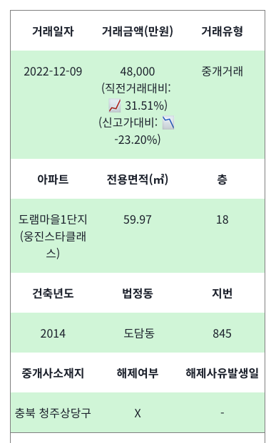 거래금액은 4억8천만원으로 직전 거래금액과 비교했을 때 31.51% 상승한 금액이지만, 신고가와 비교했을 때는 23.20% 하락한 금액이라는 것을 알 수 있습니다.
