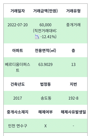 그리고 가장 중요한 거래금액은 6억원이며, 직전거래대비 12.41%하락 했다는 사실도 알 수가 있습니다.