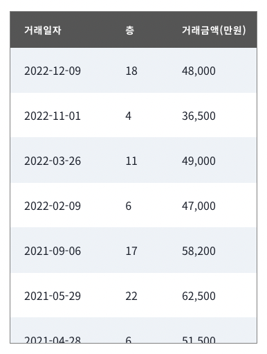 위 테이블에 보시면 2021년 5월 29일에 신고가(6억 2천 5백만원)를 찍은 이후로 총 5건의 실거래가 있었습니다.