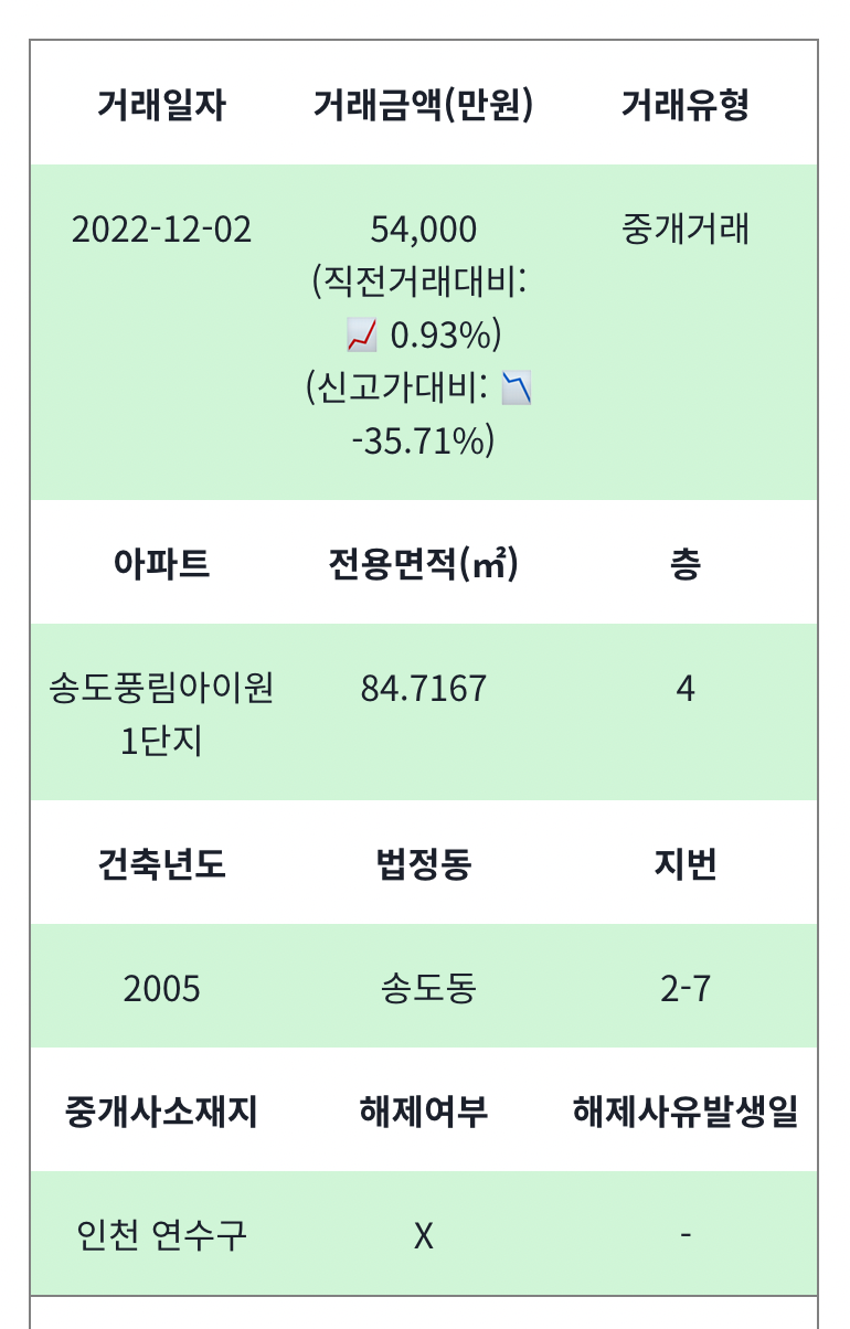 여기서 중요한 것은 신고가 대비 35.71% 하락했다는 것인데요, 그만큼 지금 송도풍림아이원1단지 아파트 가격이 빠르게 하락하고 있다는 것을 알 수 있습니다.